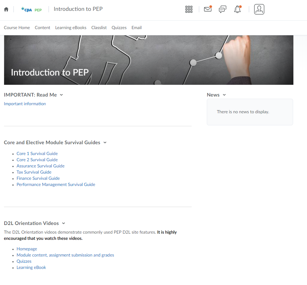 The PER orientation is available from within Desire2Learn (D2L). If you are accessing PERT for the first time, enter https://education.cpacanada.ca/d2l/loginh/ into your browser bar to log into D2L.